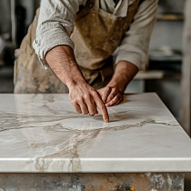 На каждой плите «Элемента» лежит отпечаток этого древнего союза. Мягкие, дымчатые переходы напоминают о текучести воды. Чёткие графичные линии отсылают к разломам земной коры. Тёплые золотистые ноты передают жаркое дыхание планеты. А лёгкая, деликатная фактура хранит прикосновение воздуха, веками скользящего по поверхности камня.