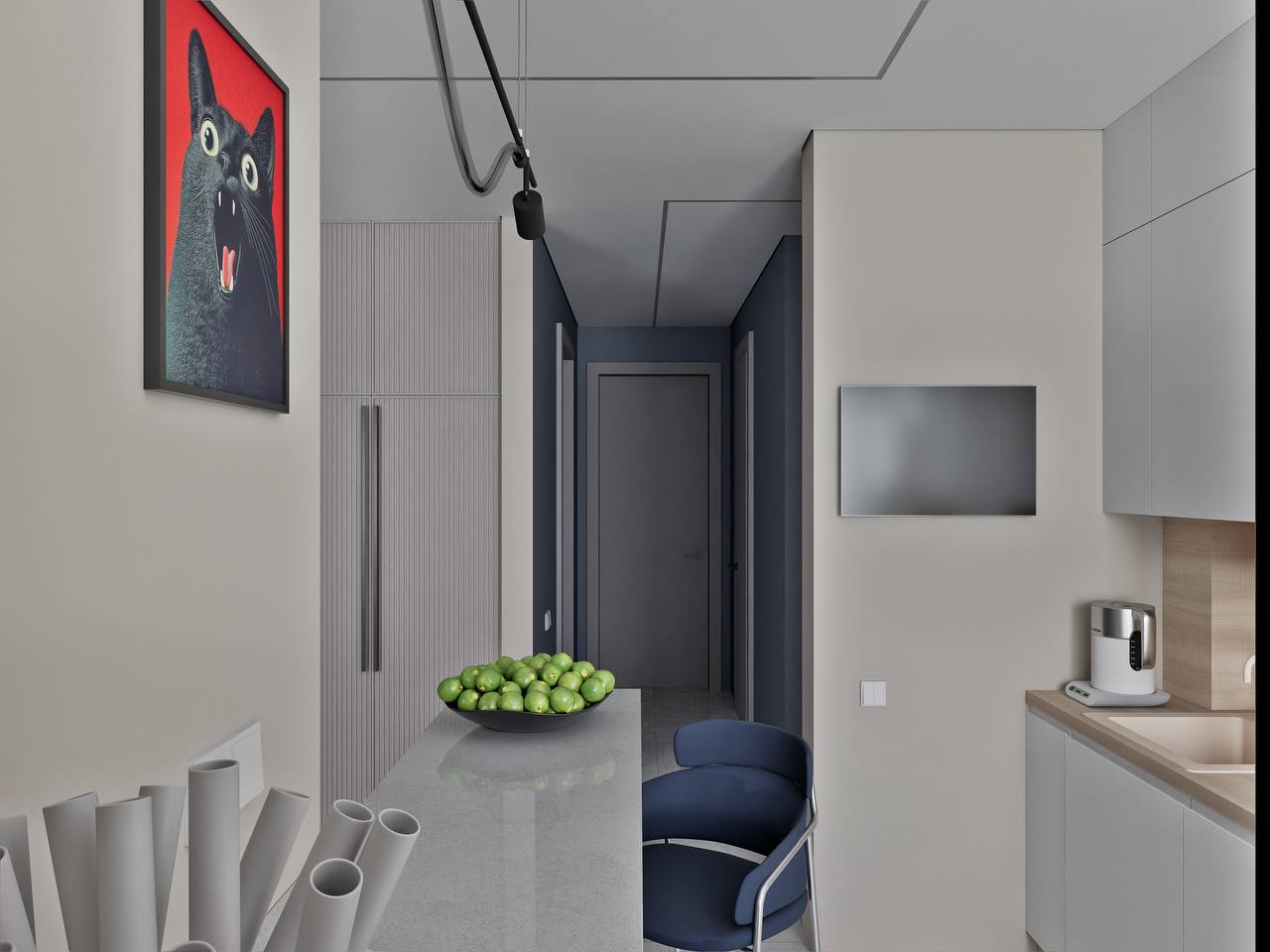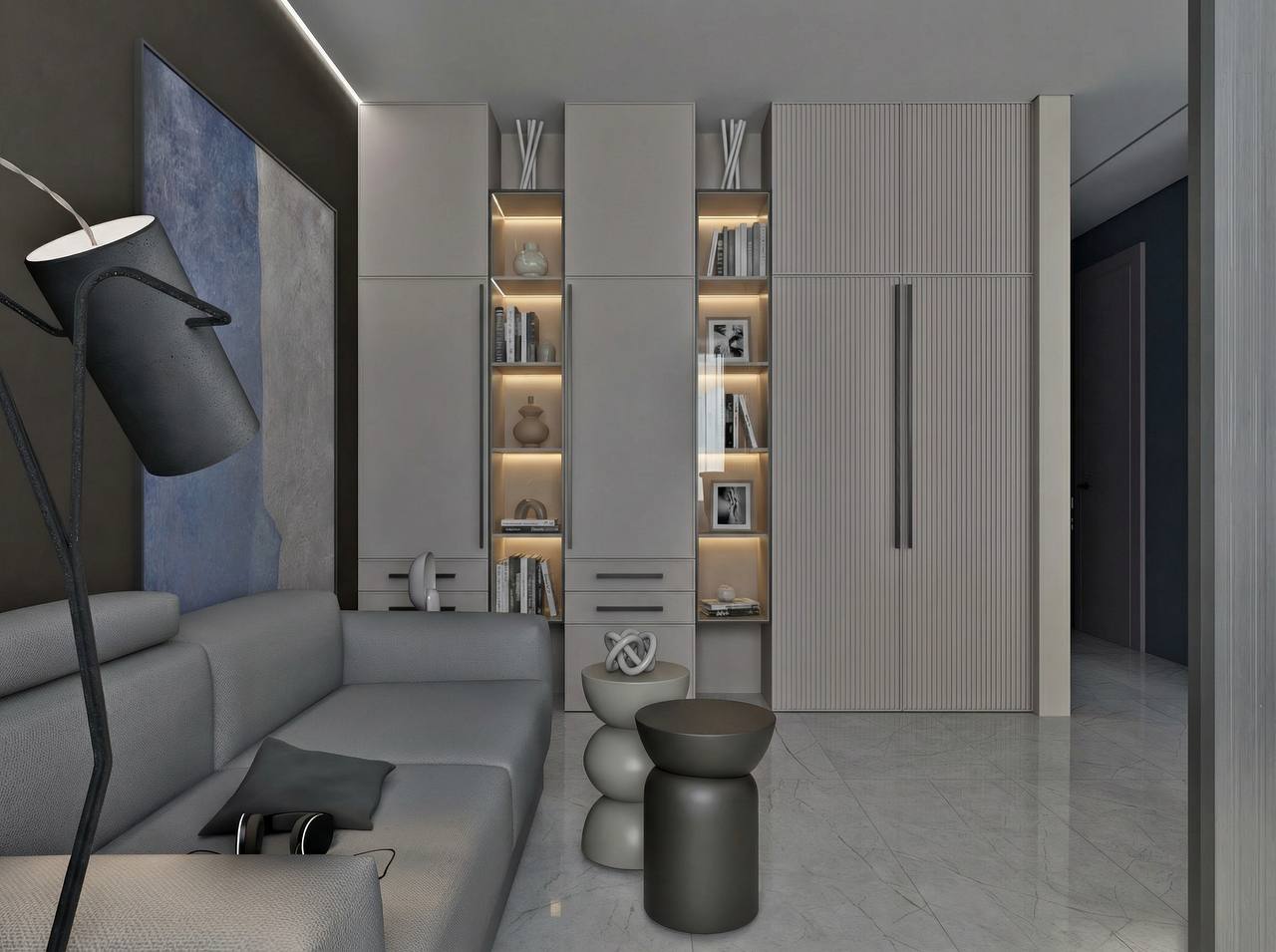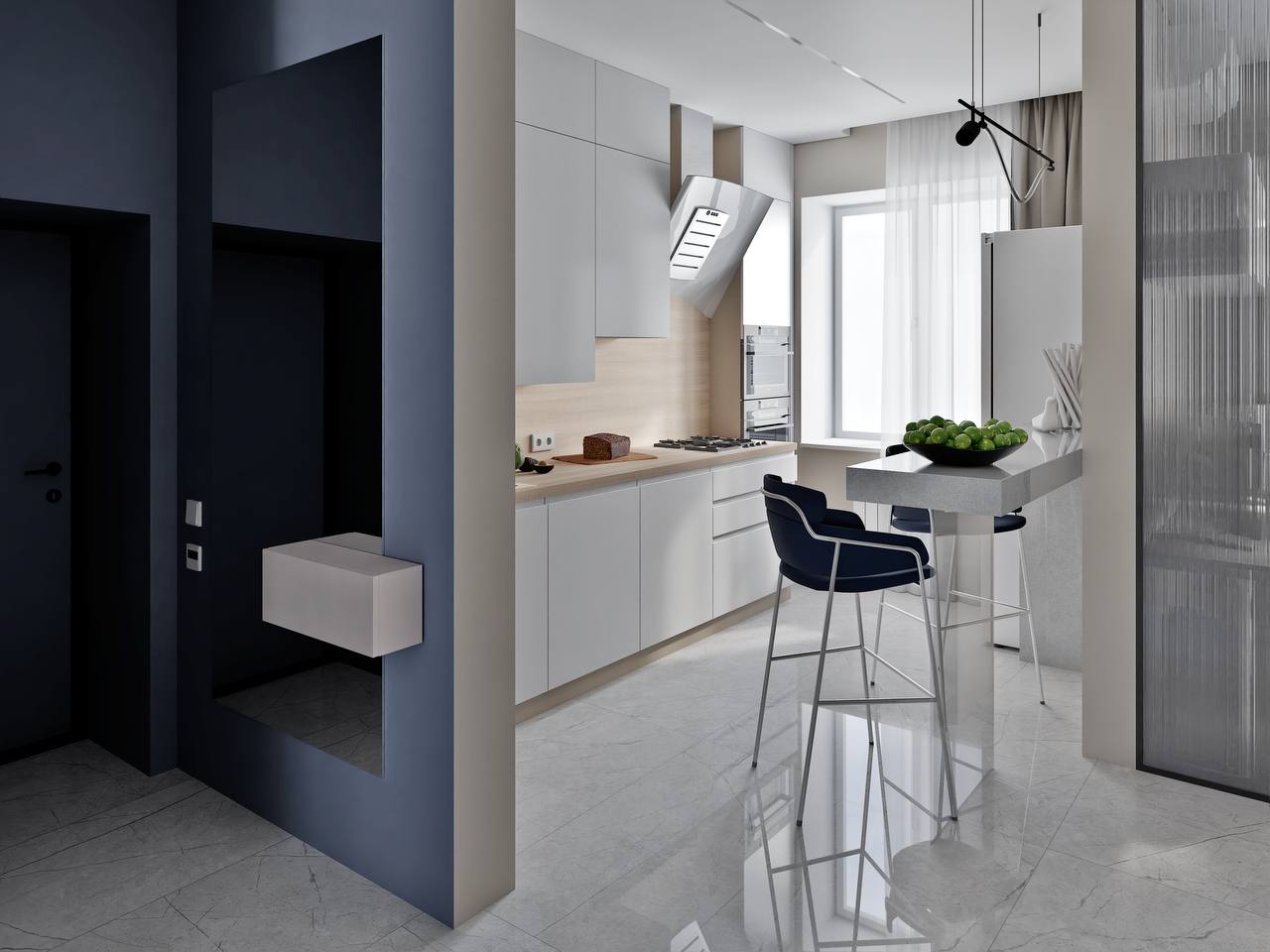 Интерьер по проекту дизайнера Эльвиры Пановой — это пример современной минималистики, продуманной до мельчайших деталей. Объединённое пространство кухни, рабочей зоны и гостиной выглядит светлым и цельным благодаря полированному керамограниту Нолана с мраморным рисунком. Он наполняет интерьер ощущением элегантности и визуальной лёгкости.