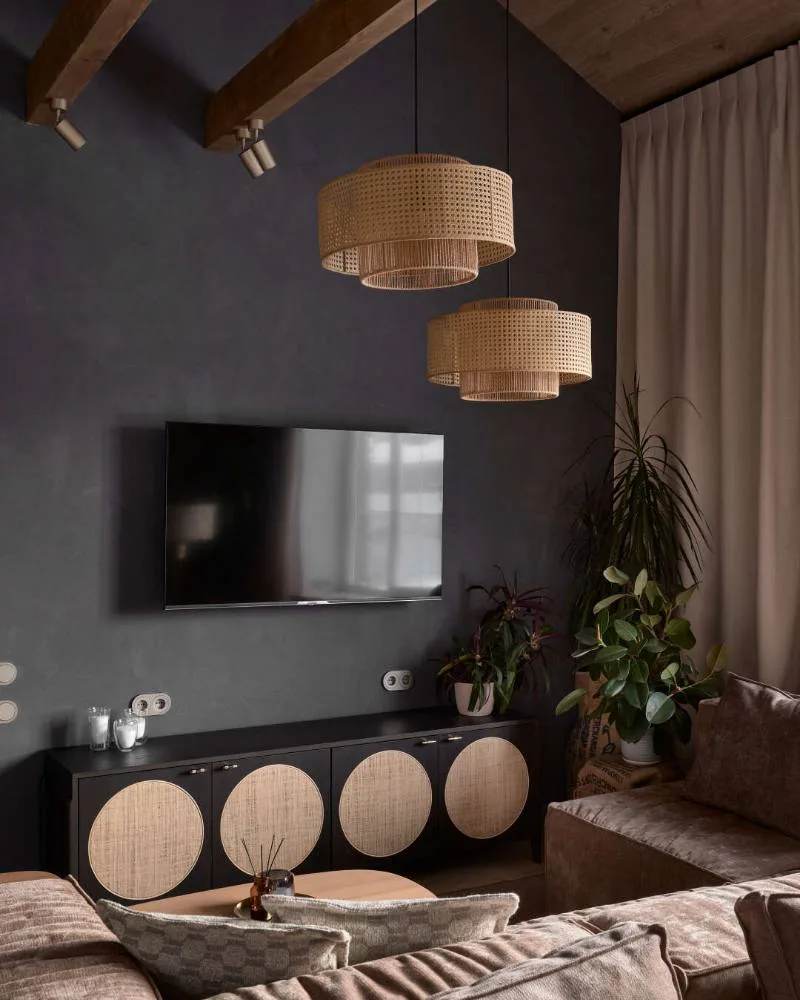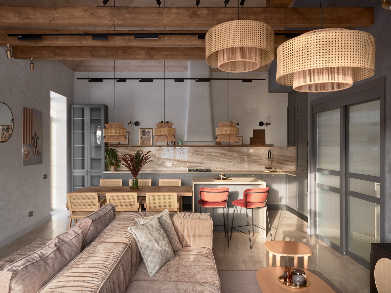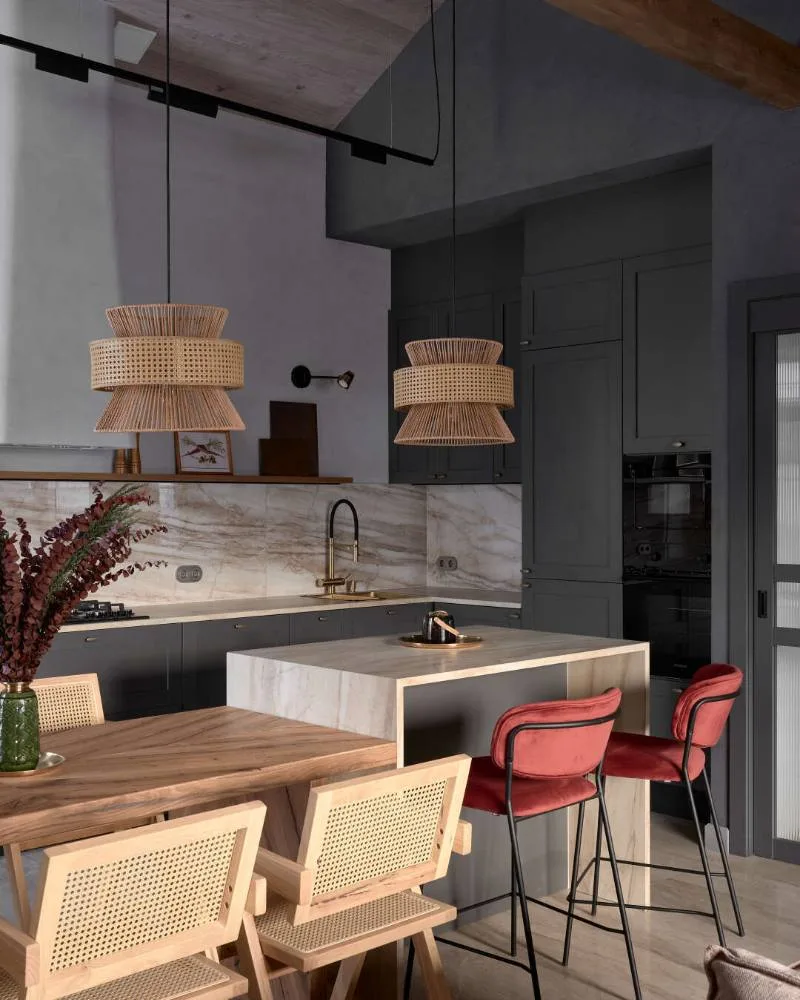 В этом проекте кухня получила по-настоящему благородное звучание. Для фартука, острова и столешницы дизайнеры использовали керамогранит из коллекции Бернини — тёплый бежевый мрамор в форматах 60х120 и 80х160 в матовом и полированном исполнении.